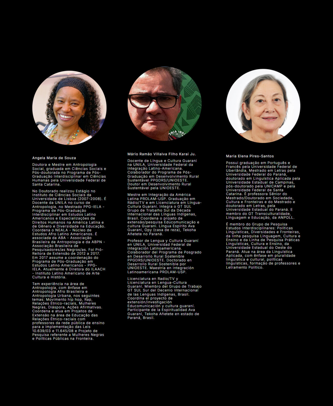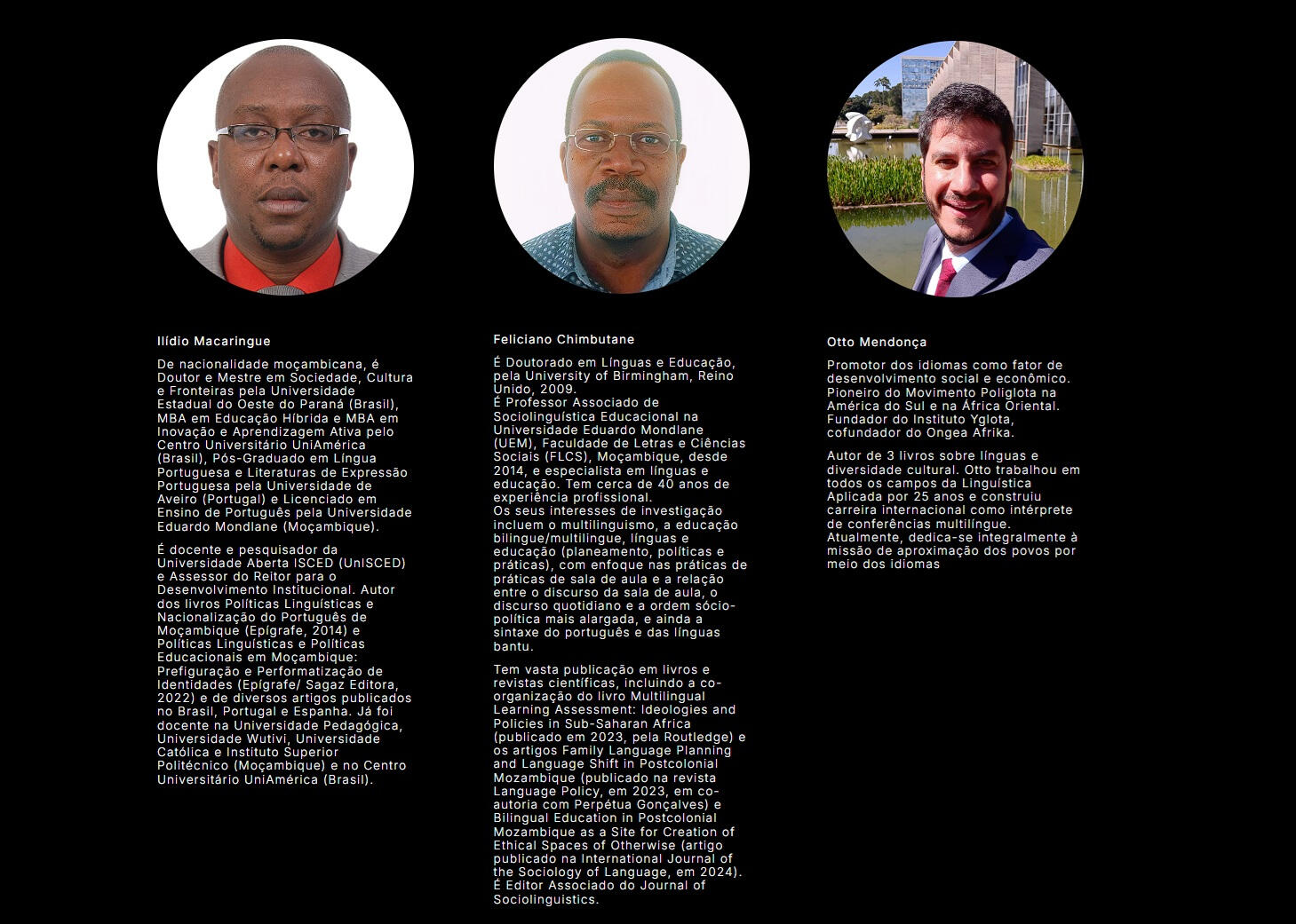 Alexandre António TimbanePós-Doutor em Filologia e Língua Portuguesa, no Departamento de Letras Clássicas e Vernáculas, da Universidade de São Paulo, Pós-Doutor em Letras pelo Departamento de Letras Vernáculas, Universidade Federal de Sergipe, Pós-Doutor em Linguística Forense pela Universidade Federal de Santa Catarina, Pós-Doutor e Doutor em Linguística e Língua Portuguesa pela Universidade Estadual Paulista Júlio de Mesquita Filho, Mestre em Linguística pela Universidade Eduardo Mondlane, Moçambique, Licenciado e Bacharel em Ensino de Francês pela Universidade Pedagógica, Moçambique. É docente da Universidade de Integração Internacional da Lusofonia Afro-Brasileira, Campus dos Malês e da Universidade Estadual Feira de Santana (Programa de Pós-Graduação em Estudos Linguísticos).Tem experiência no ensino e na pesquisa em Sociolinguística e Dialetologia com enfoque na variação e mudança lexical do Português (Estudos do Léxico) e ensino, Contatos linguísticos, Linguística Forense e Línguas Bantu moçambicanas. Orientou e orienta pesquisas na Pós-Graduação, Graduação e Iniciação Científica. É membro do Grupo de Estudos de Linguística Forense, membro da The International Association of Forensic Linguists (IAFL), membro do Núcleo de Estudos da Sociolinguística, membro do Grupo de Estudos da Fonética Acústica. Participa do Grupo de Pesquisa África-Brasil: produção de conhecimento, sociedade civil, desenvolvimento e cidadania global (UNILAB) e do Projeto Dicionário de nomes em uso no Brasil (UnB).Participa do Comité Editorial Científico de várias Editoras brasileiras e é parecerista em revistas científicas qualificadas no Brasil e no exterior. É Editor-chefe da Njinga Sepé: Revista Internacional de Culturas, Línguas Africanas e Brasileiras (ISSN:2764-1244).